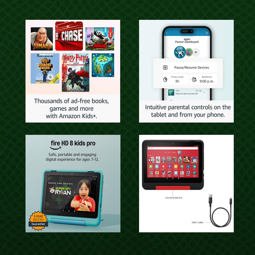 Keep kids entertained and learning with the Amazon Fire HD 8 Kids Pro tablet—a perfect blend of fun, safety, and durability. Featuring a vibrant 8-inch HD display, fast performance, and up to 13 hours of battery life, it’s built for all-day use at home or on the go. Parents can feel confident with easy-to-use parental controls, allowing you to manage screen time, filter content, and set educational goals. Designed with older kids in mind, it offers access to a curated digital store packed with age-appropriate apps, games, books, and videos. Plus, its slim yet durable design and worry-free guarantee mean it’s ready to handle everyday adventures.